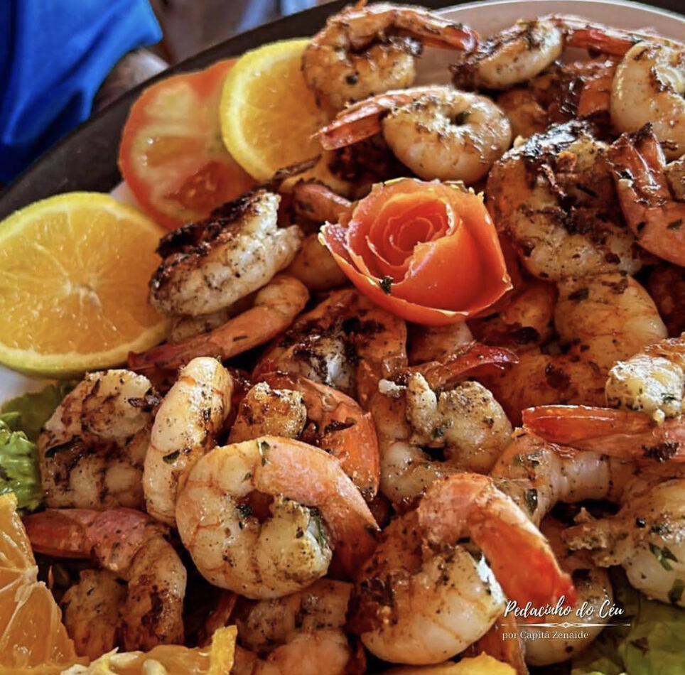 Espetinho de camarão com molho de alho e ervas, acompanhado de arroz e batata frita. Essa sem dúvida é uma das melhores opções do nosso cardápio.